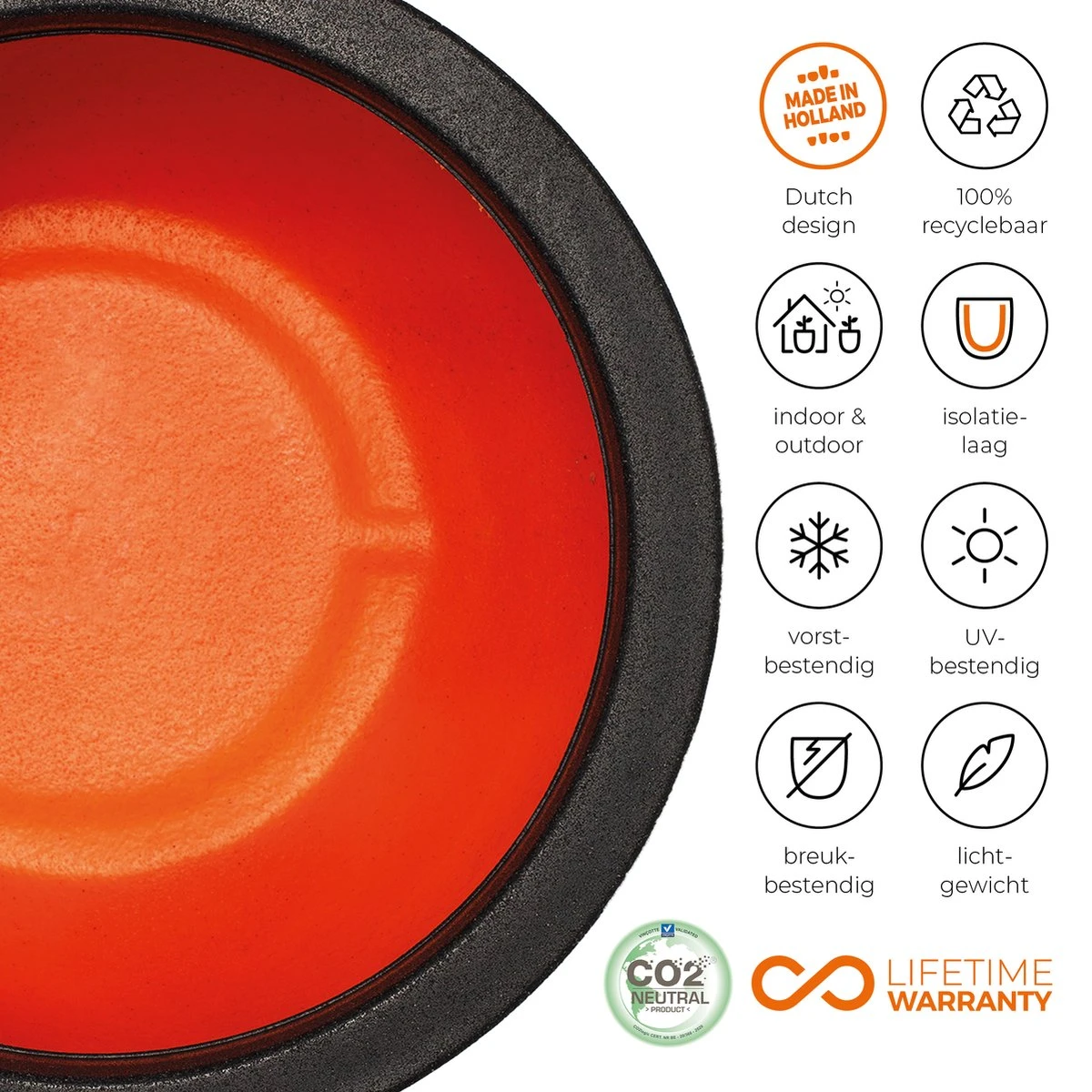 Deze duurzame bloempot uit de Capi Urban Smooth NL collectie is CO2 neutraal geproduceerd en gemaakt met gerecyclede materialen. De oranje binnenkant van de pot is een knipoog naar de Nederlandse productie en tevens een isolatielaag die de potten beschermt tegen vorst in de winter en hitte in de zomer. Deze extra laag zorgt ook voor meer stevigheid, waardoor deze pot breukbestendig is. De pot is geschikt voor indoor en outdoor gebruik en beschikt over een levenslange garantie.
