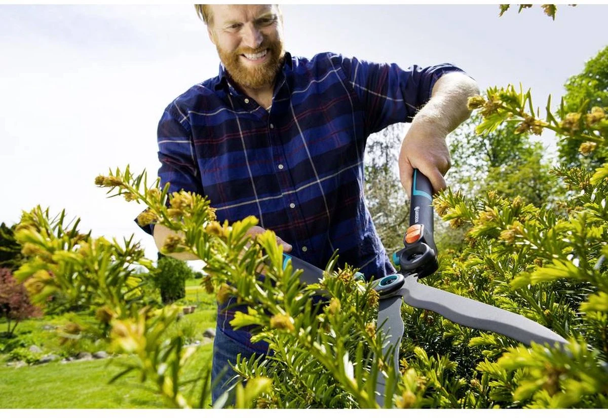 “De EnergyCut van GARDENA overtuigt met zijn ongeëvenaarde 2-in-1-functie en zorgt dat u snel en krachtig werkt met een hoge efficiëntie. Bij het snoeien van heggen of struiken staat een dikkere tak een perfect gelijkmatige snoeibeurt soms in de weg. Activeer dan extra kracht door een druk op de knop. Door de openingshoek te vergroten, neemt de hefboomwerking toe en ontstaat extra kracht.