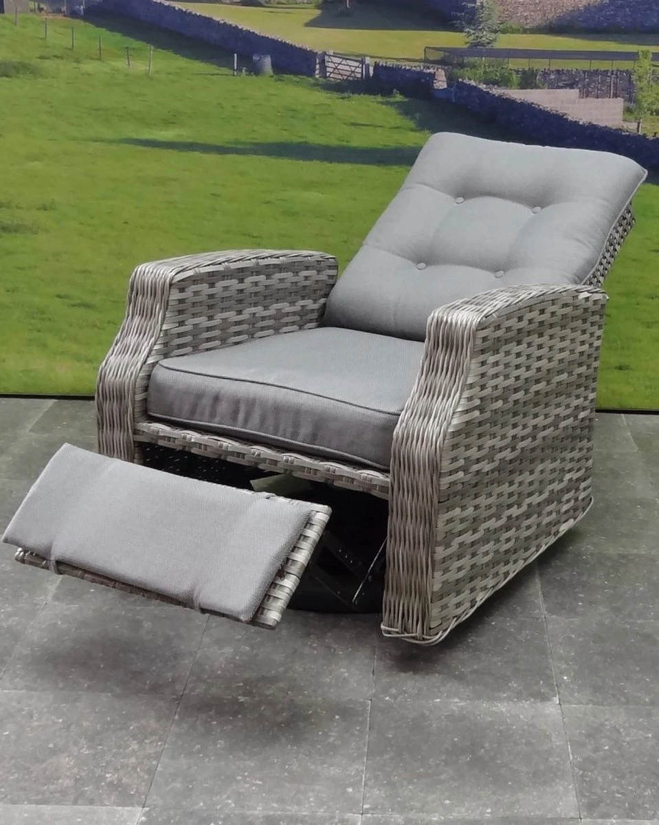 De Kreta draaibare stoel is onderscheidend ten opzichte van andere loungestoelen door de draaipoot. De lounge stoel geeft u de mogelijkheid om met de zon mee te draaien, zonder de stoel te verplaatsen! De stoel is voorzien van een gasveer waardoor de rugleuning heerlijk achterover kan. Ook heeft de stoel een verstelbaar voeteneind. De kussens zijn donker grijs en het vlechtwerk licht grijs.